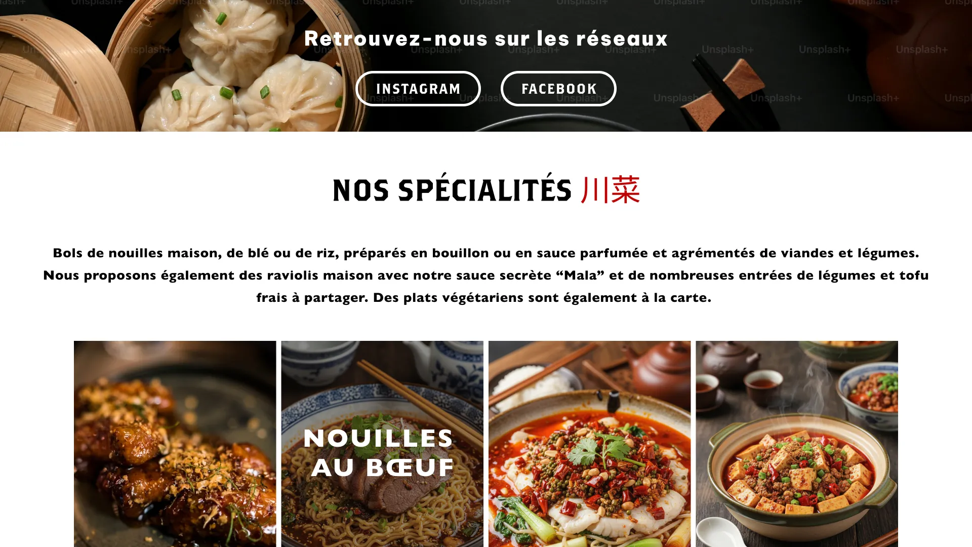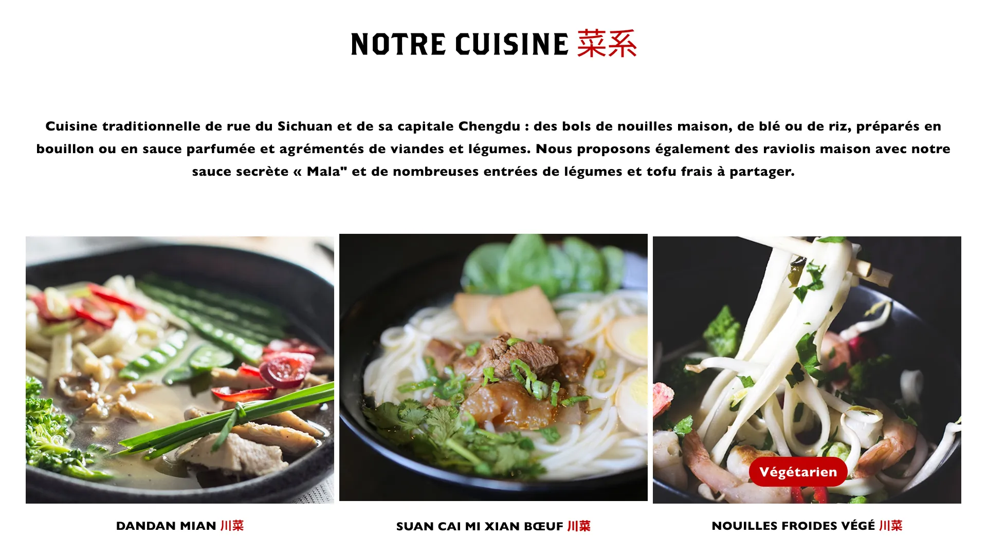 Cible : amateurs de street food, passionnés de cuisine asiatique et curieux en quête de nouvelles expériences gustatives. Expérience utilisateur : navigation fluide, mise en avant des plats signatures, storytelling autour des épices et des sensations caractéristiques du Sichuan. Création d’une page dédiée pour chaque restaurant afin d’assurer une lecture claire et intuitive pour le visiteur.