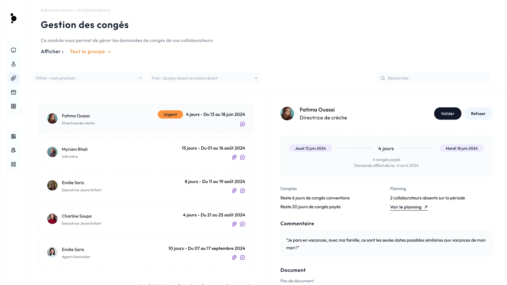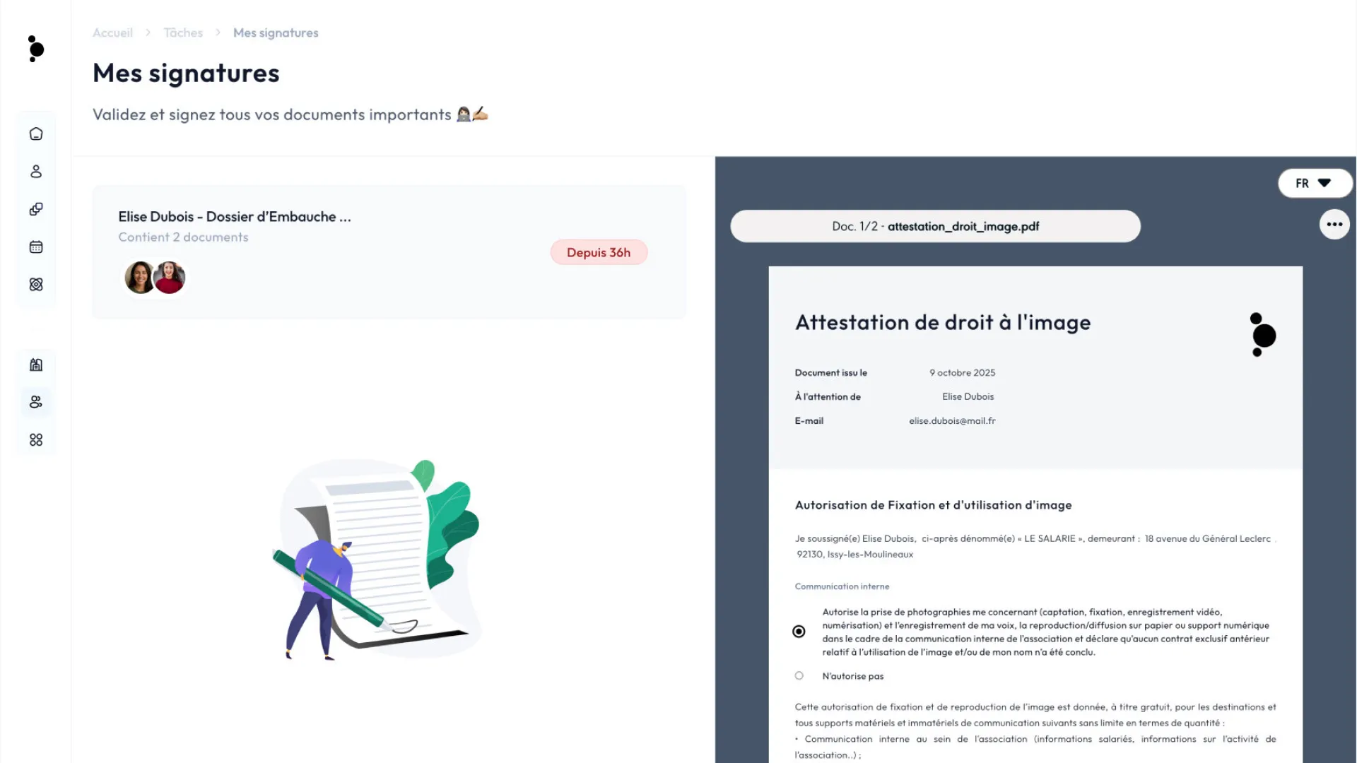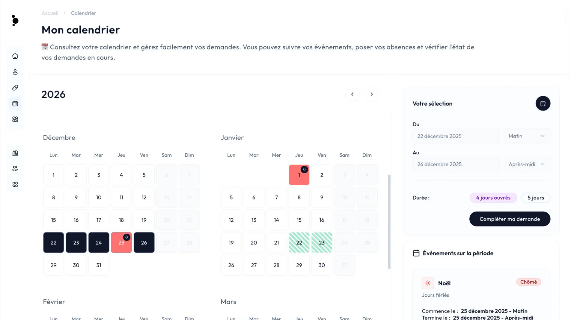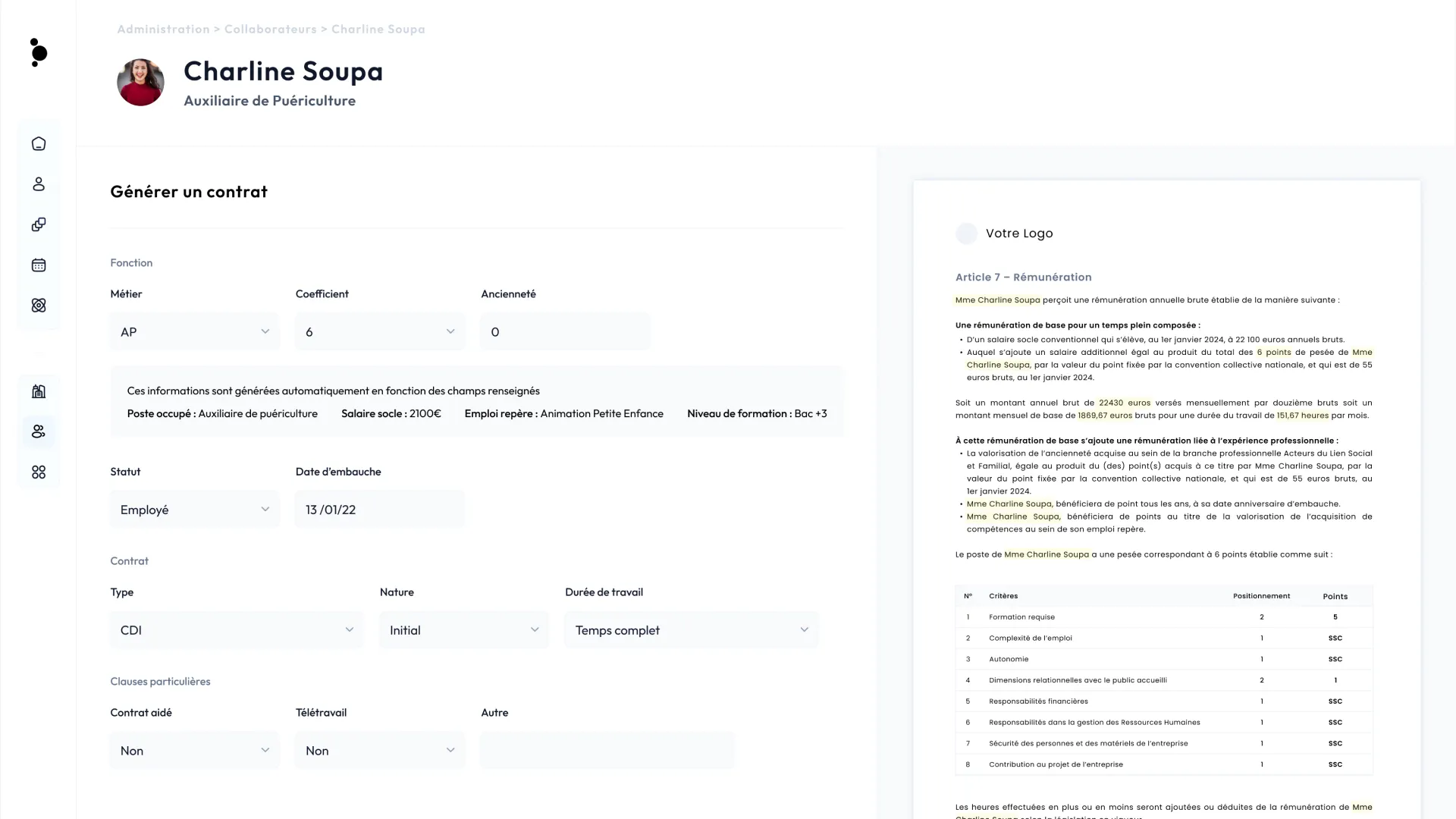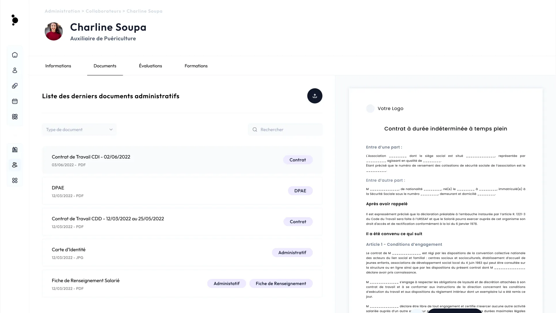 Fonctionnalités : gestion des collaborateurs, suivi des contrats, gestion des absences et congés, automatisation des documents et centralisation des données. Expérience utilisateur : interface claire, navigation rapide, logique orientée productivité et simplicité d’usage.